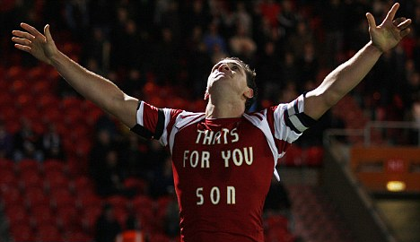 And it was only fitting that 14 minutes into the game that Billy scored a spectacular goal , after he scored he lifted his t-shirt to reveal a message 'That's for you, son.'